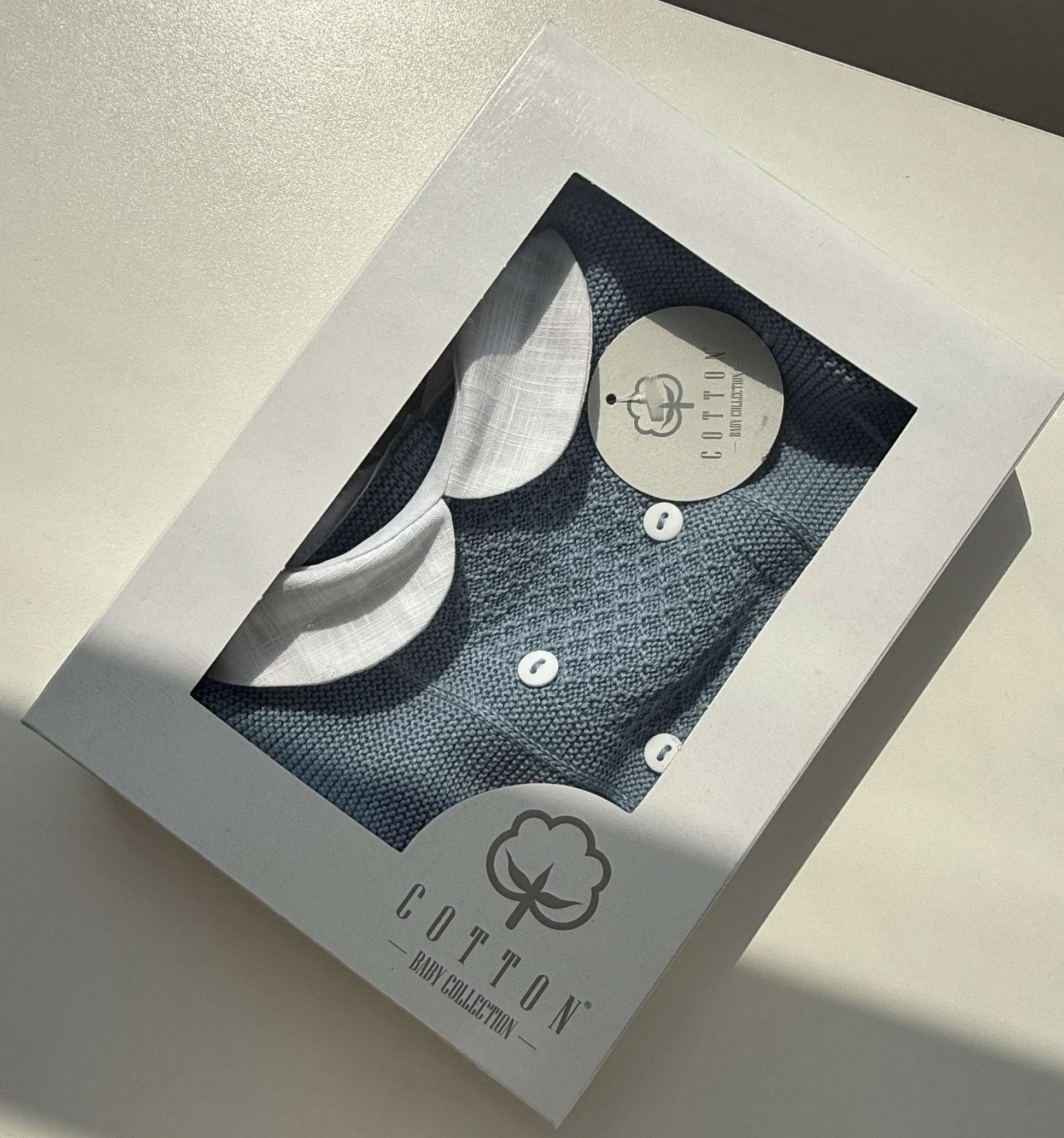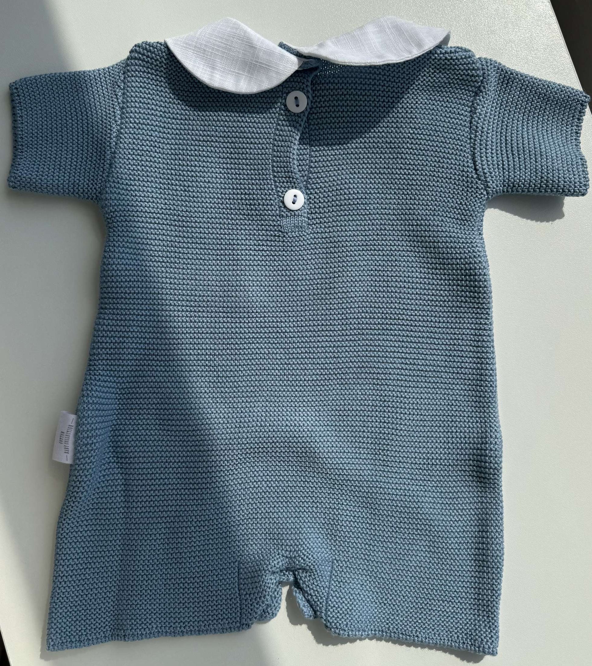 Handcrafted in Portugal from the softest cotton, our Cobalt Charm Knitted Romper blends timeless style with everyday comfort. This short-sleeved design features a textured knit front, delicate double-breasted button detail, and a crisp white collar for a classic touch.