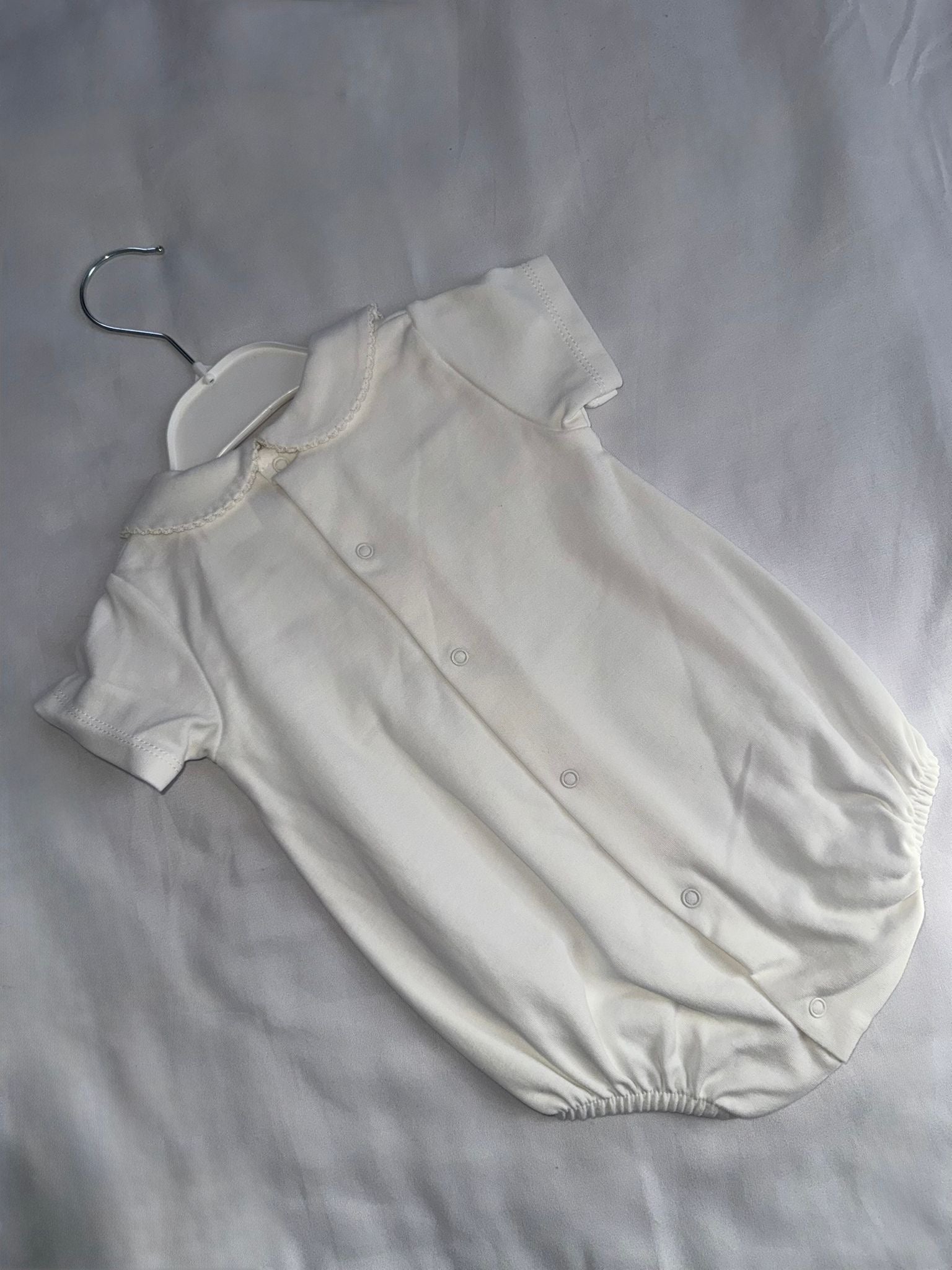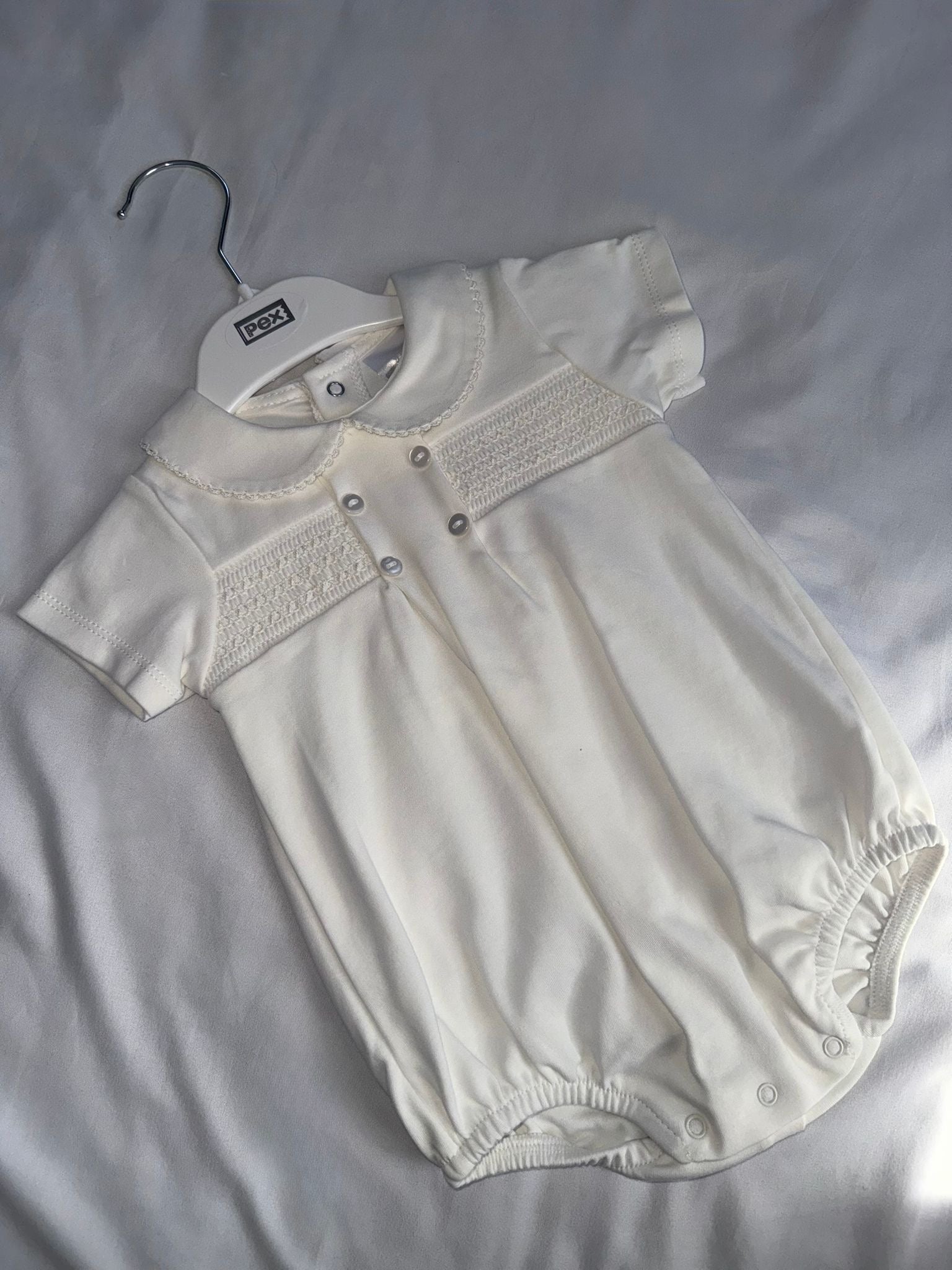 Smart short romper made from the finest quality soft ivory cotton. Intricately smocked across the bodice with mother of mother of pearl style buttons. Handy press-studs to the back and between the legs.