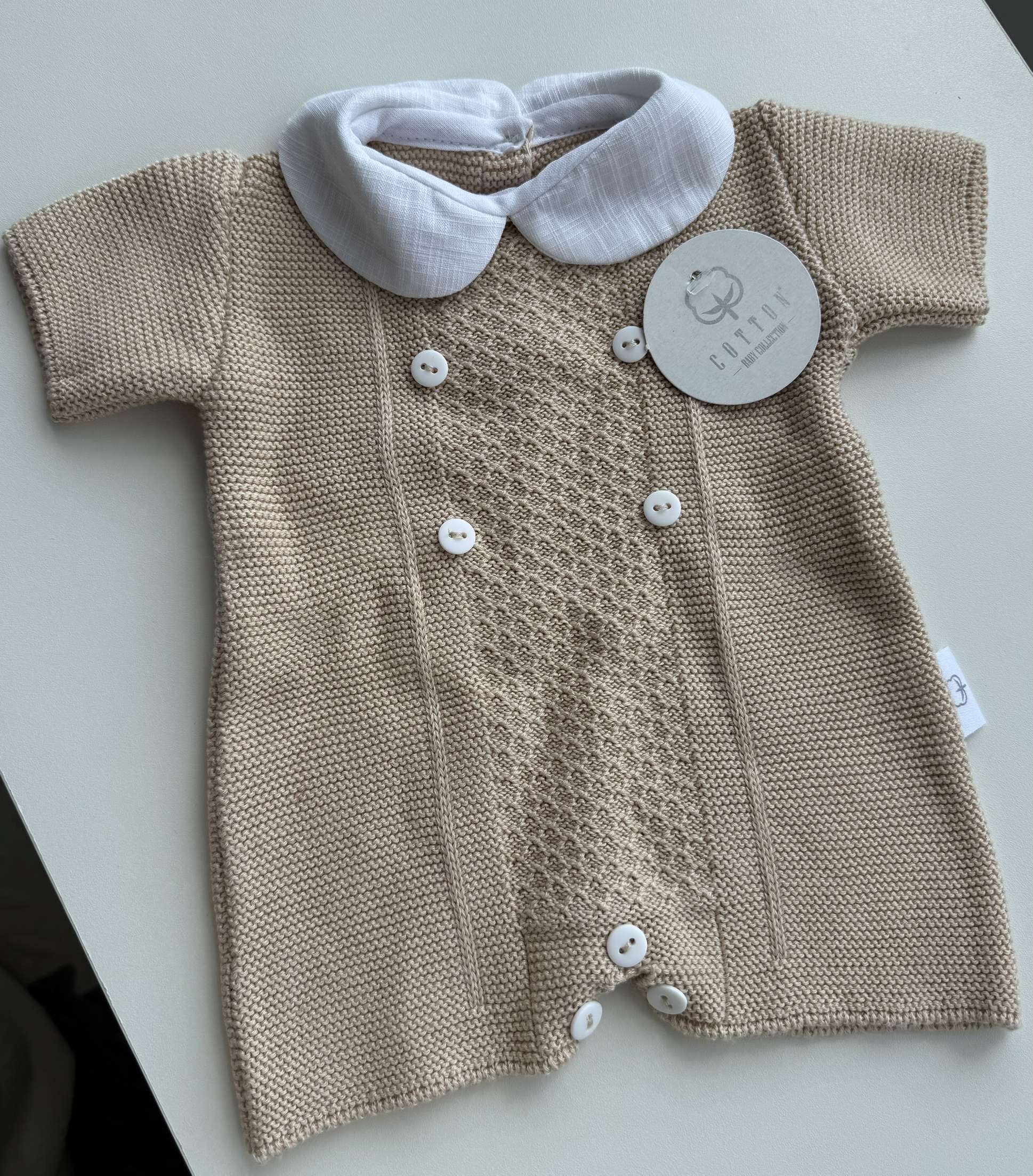 Handcrafted in Portugal from luxuriously soft cotton, our Charm Knitted Romper in Sandstone is a timeless piece designed for comfort and charm. Featuring a textured knit panel, double-breasted button detail, and a crisp white Peter Pan collar, it’s perfect for both everyday elegance and special occasions.